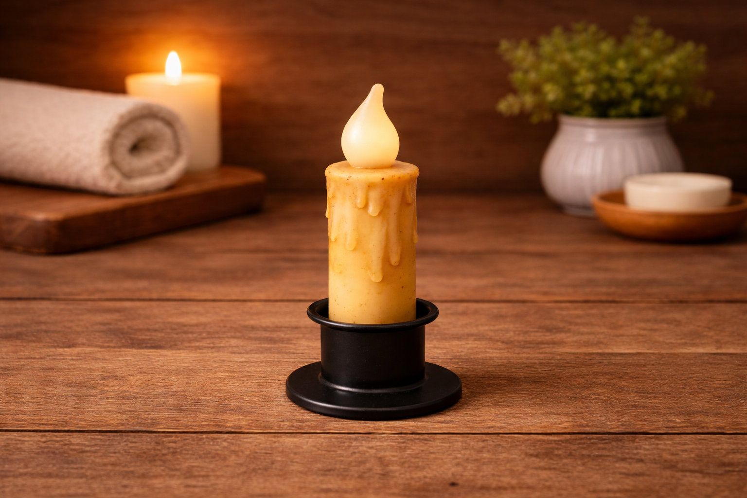 Battery Powered Candle with HolderAdd warmth and charm to any space with this flameless, wax-drip candle set in a black metal base.$12.00View detailsAdd to cart